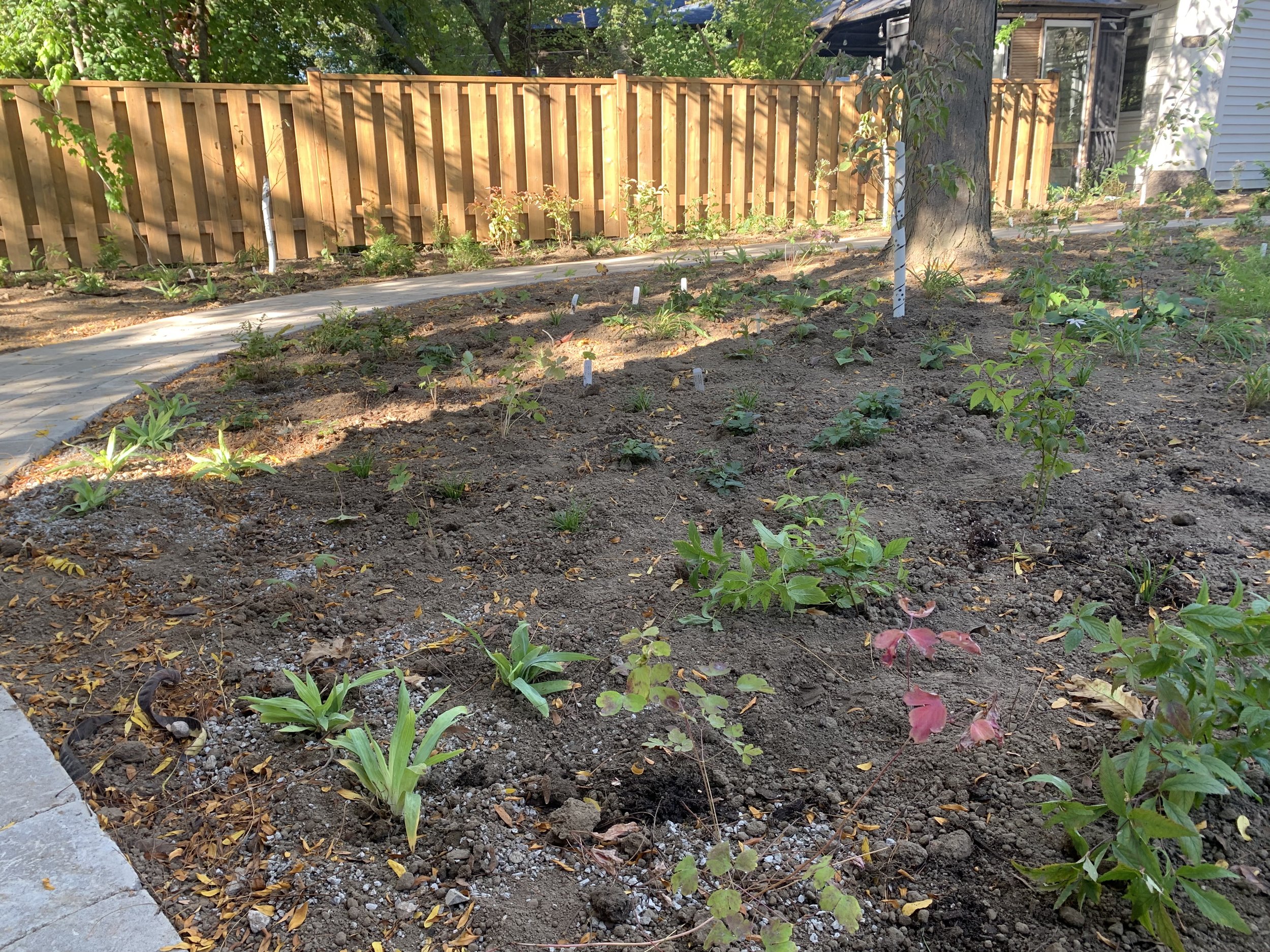 The backyard sits beneath a mature honey locust, creating shifting, dappled shade with occasional sun pockets. Honey locusts allow enough light to support a broad range of woodland edge and glade species, with forest floor plants in the shadier zones. This allowed us to design a diverse plant palette that would feel layered, natural, and resilient.