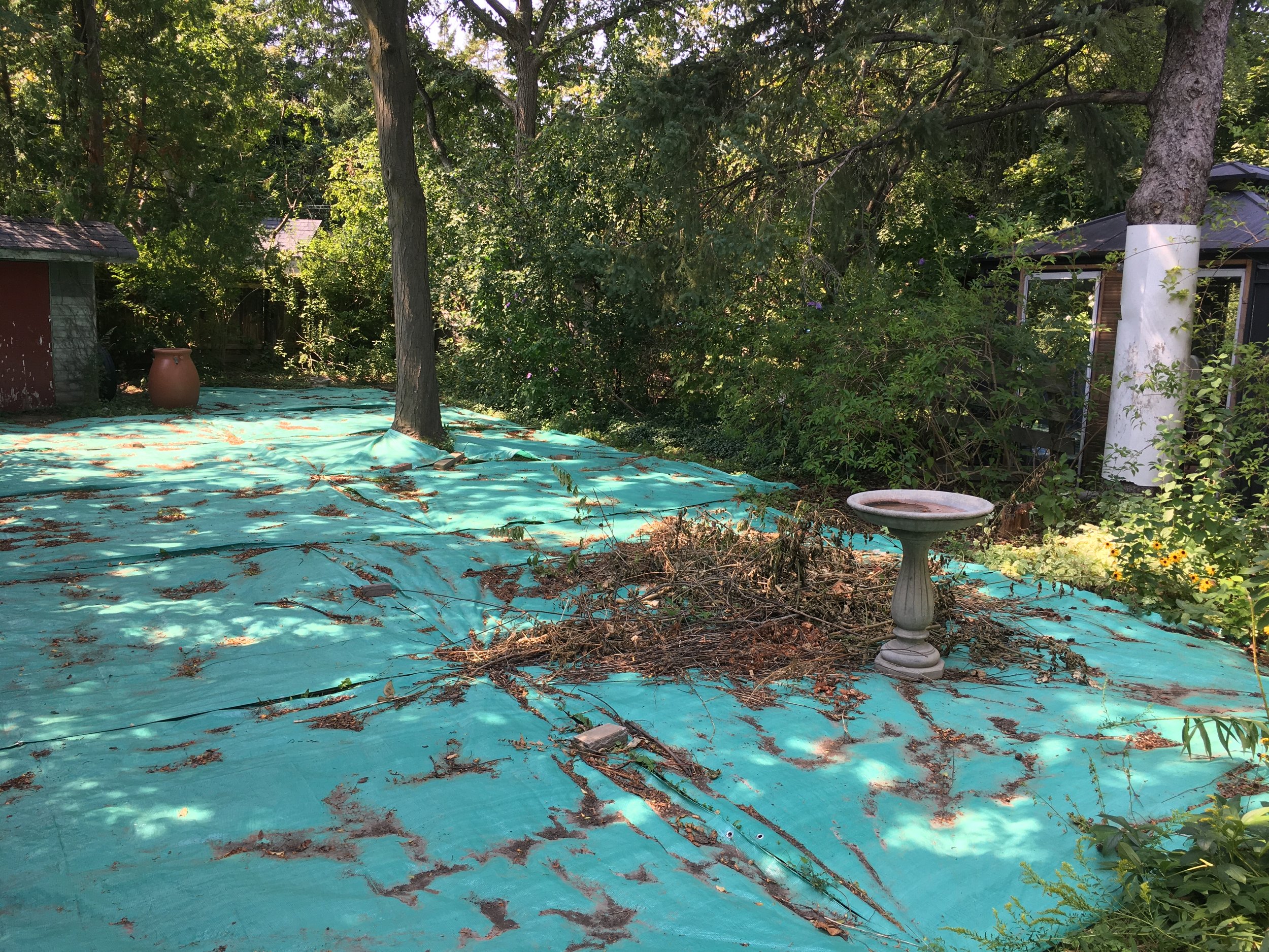 When we first visited the client’s backyard, it was overrun with invasive species including buckthorn, periwinkle, and goutweed. They had spread a tarp over the site to stop the invasive plants from spreading while they tackled the buckthorn growing along the fenceline. The space felt lifeless, aesthetically unappealing, difficult to maintain, and disconnected from nature.