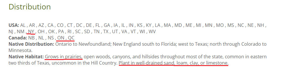 Below, you can see here that Asclepias tuberosa is native to my area on a provincial level. We know that we shouldn’t be choosing plants based on political boundaries but this give us a good starting point. Make a list of potential plants from this list and INCLUDE THEIR LATIN NAMES in the list because you will need them soon. Since my ecoregion covers parts of Ontario, Quebec and New York, I’ll consider Asclepias tuberosa to be appropriate thus far, considering these 3 jurisdictions are included in the distribution list.